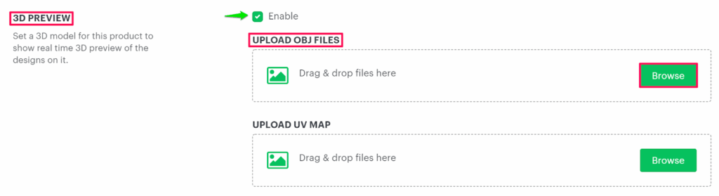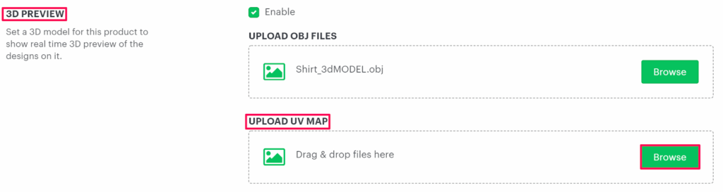 7. In this step, we will be uploading the UV Map for the 3D model. Scroll up to find the 3D Preview. In the Uplaod UV Map section, click “Browse” to upload the UV map for the 3D model.