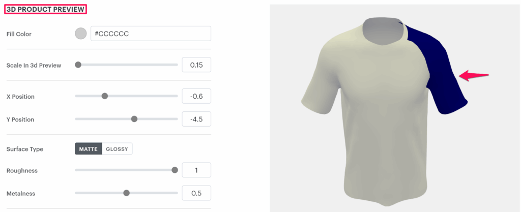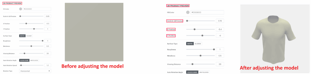 6. Under 3D PRODUCT PREVIEW, adjust the 3D model by setting up the values for Scale in 3D preview, X Position and Y position. You can adjust it by dragging the toggle button.