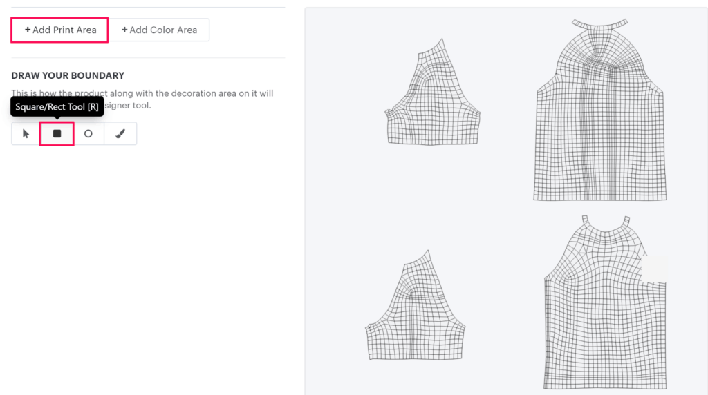 8. Scroll down to find the UV map that you have uploaded. Now, we will be configuring the print boundary by clicking the Add Print Area option. A new section will open named as Draw your Boundary.