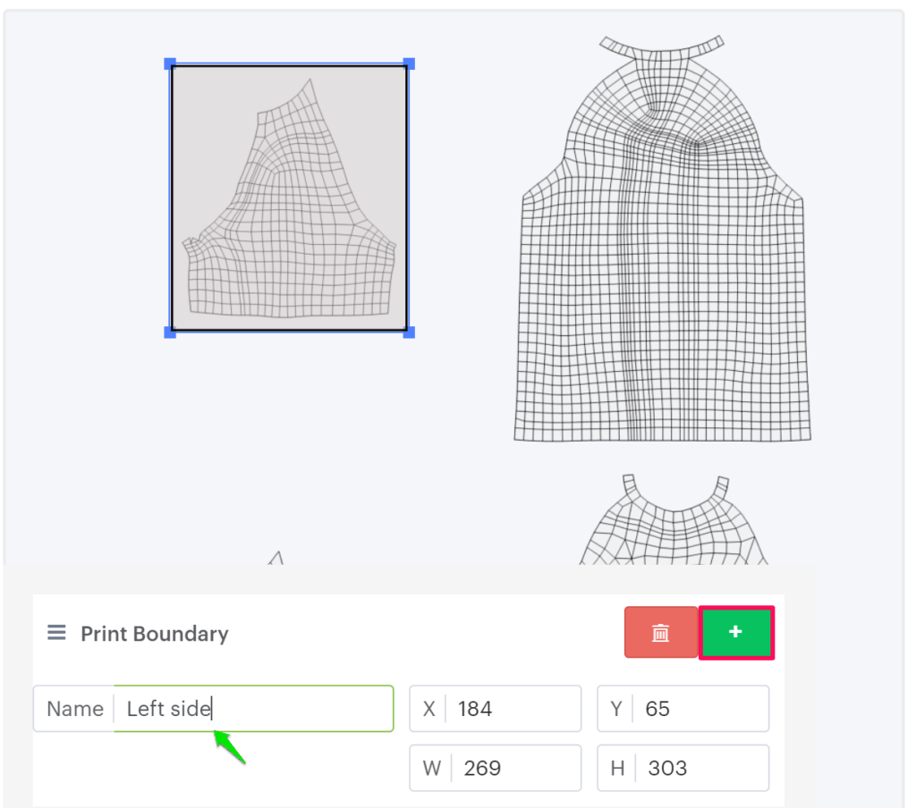10. Move to the right and draw a print boundary across the side of the product in the UV map. Once you finish drawing, a pop-up appears below. Here, you need to set the name of the print boundary, and the values for X, Y, W, and H will be populated based on the dimensions of the print area, which is drawn over the sides of the product in the UV map.