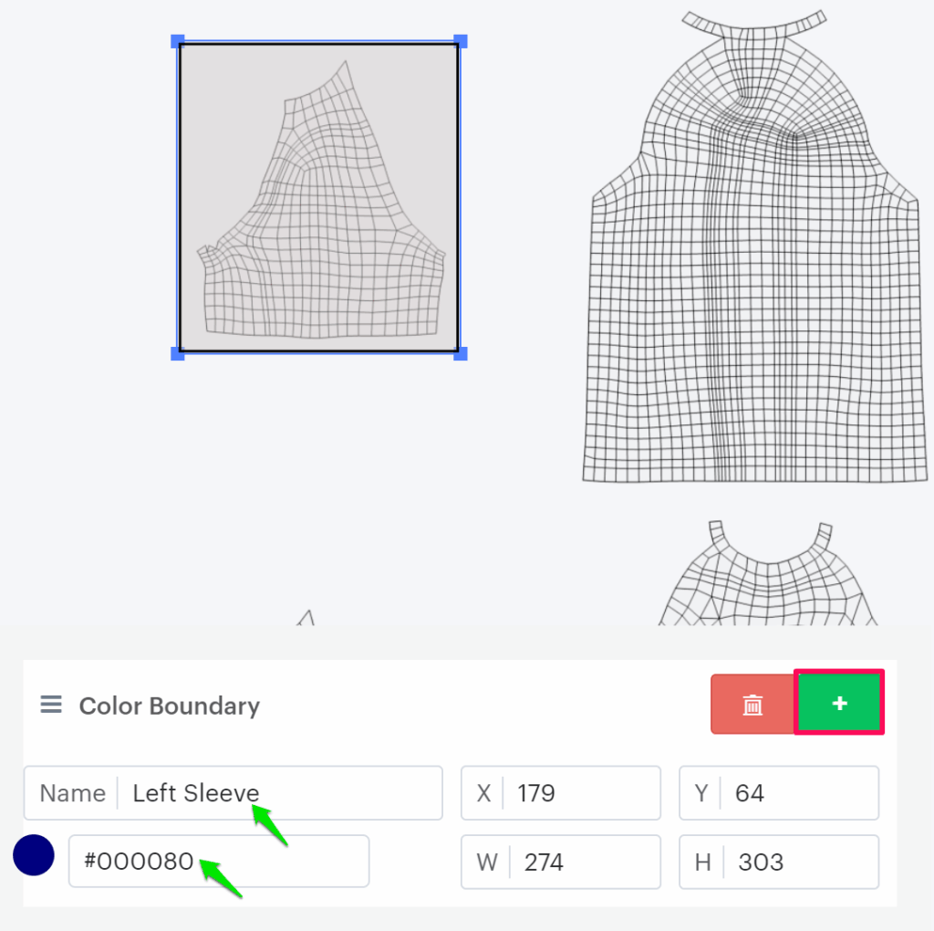 14. Move to the right and draw the color boundary across the side of the product on the UV map. Once you finish drawing, a pop-up appears below. Here, you need to set the name of the color boundary and select the color from the color picker. The value for X, Y, W, and H will be populated based on the dimensions of the area drawn over the side in the UV map.