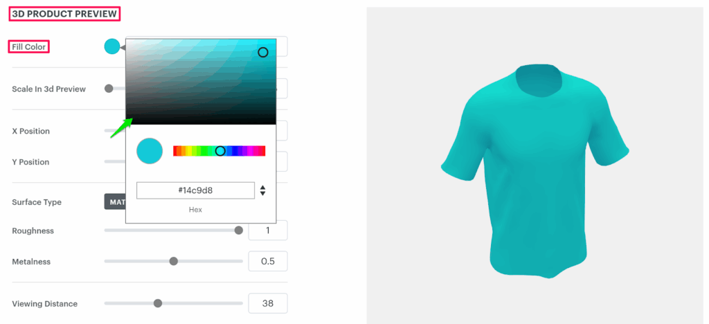 To configure it, move to the right and click the circle. A color picker will open, and select any color from the color picker. The selected color can be viewed in the 3D model, which is on the right side, and the same will be viewed by your customer.