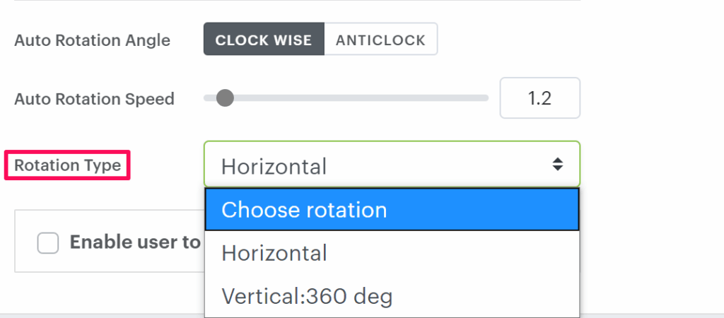 The rotation type allows you to set the type of rotation that your customer can do. There are two types of options:
