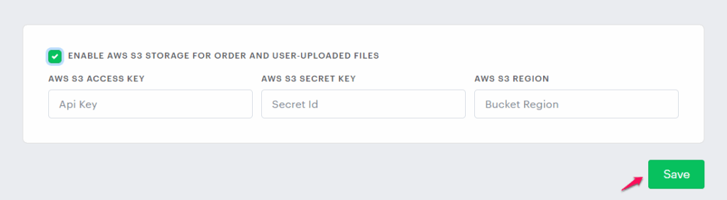 Step 3: Click on the “Enable AWS S3” checkbox. After clicking, a form will appear to enter the credentials listed above. Fill them in and click on the “Save” button.