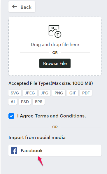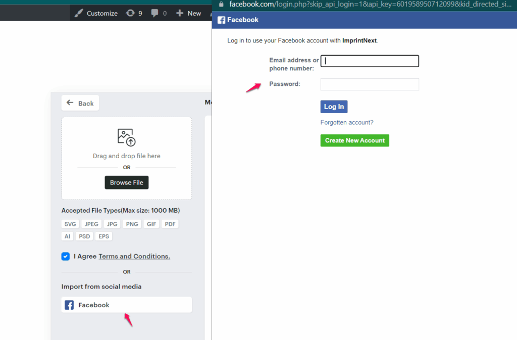 Step 5: Click on the Facebook button. A pop-up will appear where your customers must log in to Facebook with their credentials. Customers can then select any of their images from their Facebook account and use them for artwork designs on the products.