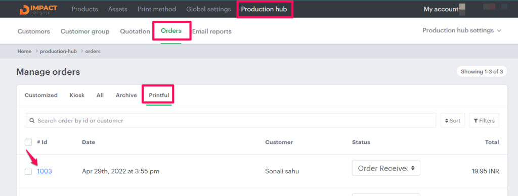 Go to Home > Production Hub > Orders and click on the “Printful” tab.