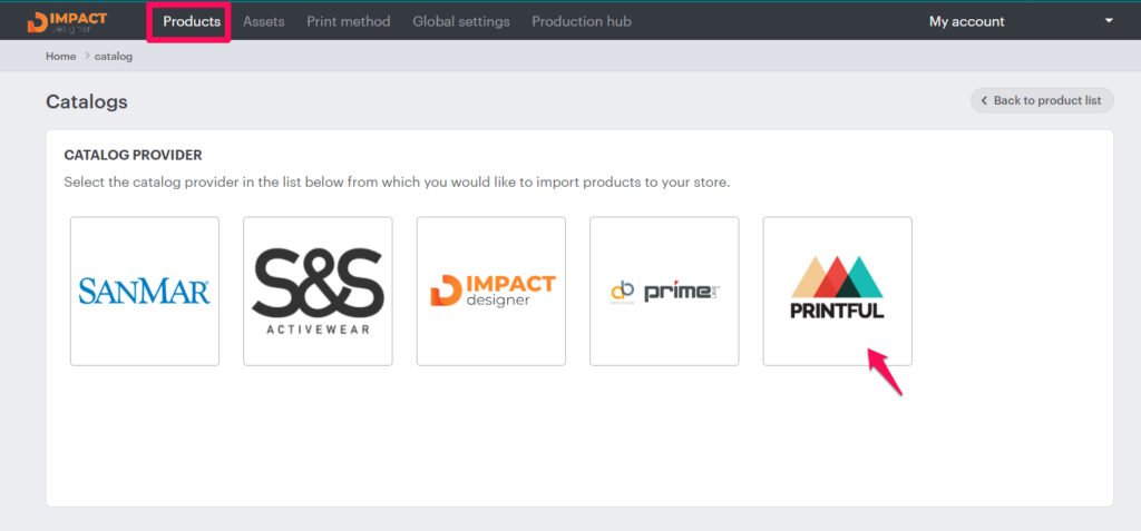 Step 6: You will be redirected to the catalogs page. Click on the “Printful” box to import catalog products from Printful.