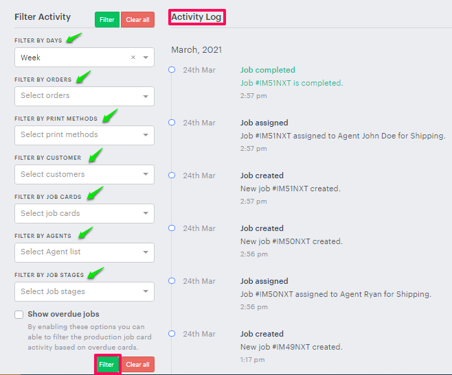 (i) Activity Log: In this section, we can view the production job activity by different filters provided.