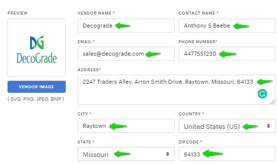 5. The vendor form will appear. Here you can update the fields like a vendor’s logo, name, contact name, email, phone number, address, city, country, state, zip code, and product categories.