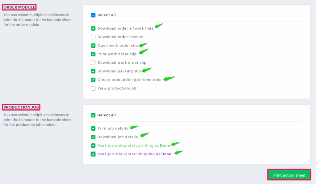 4. A new page will open. Select the different actions from the Order Module and Production Job to print the barcodes in the sheet. Scroll down and click “Print action sheet.”