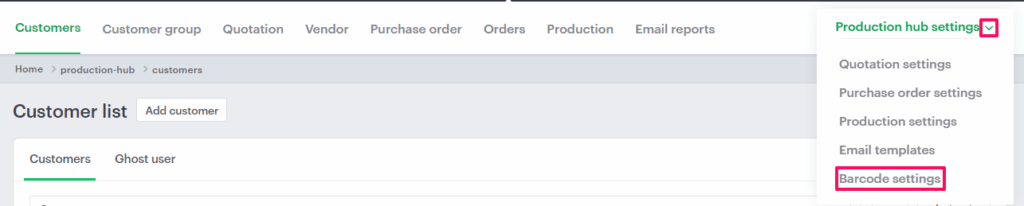 3. Move to the right and click the dropdown of Production hub settings, then select “Barcode settings.”