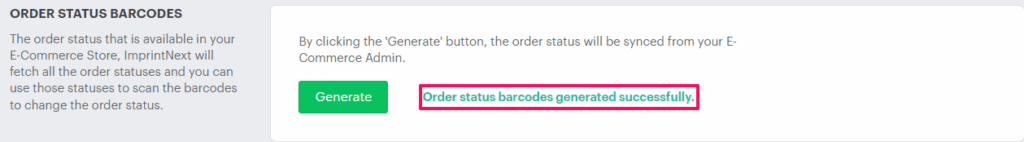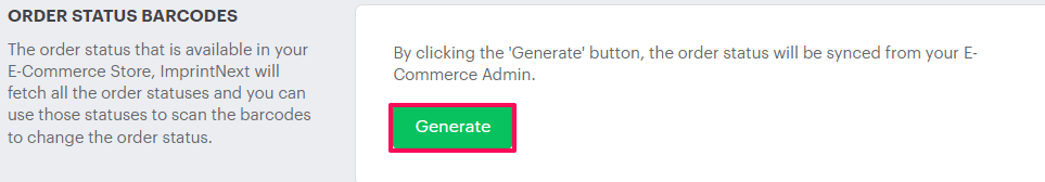 To fetch order status from E-Commerce to Impact Designer for scanning the order barcodes, you can use the Generate option.