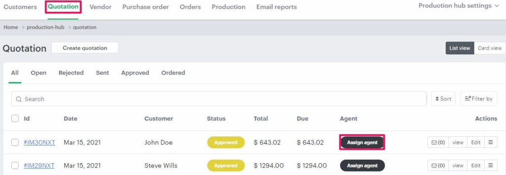 3. Click “Quotation”. The list of quotations will appear below. From the Agent column, click the “Assign Agent” button.