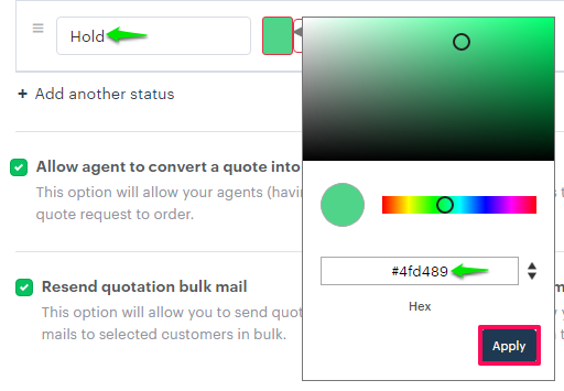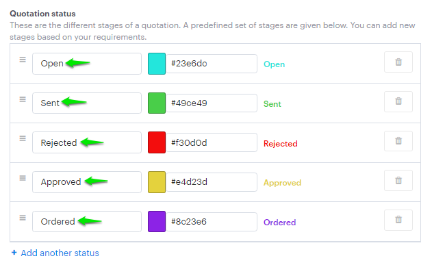 4. The Quotation Settings page will appear. Scroll down to Quotation Status. You’ll find a predefined set of stages for quotations. You can update the Status Text and Status Background Color as needed.