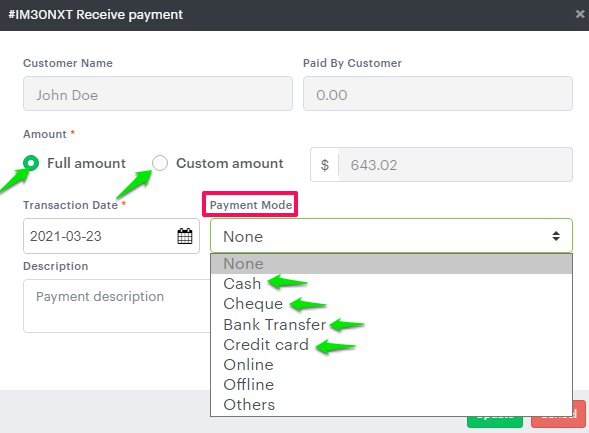 6. From Payment Mode, choose the preferred option, such as Cash, Cheque, or Bank Transfer.
