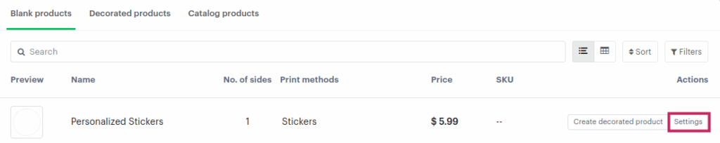 3. The products listing page will appear. Click “Settings”, which is below the Actions panel.