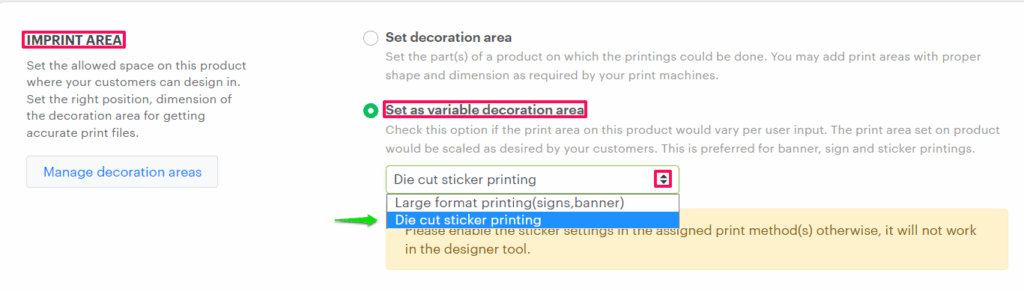 4. Scroll down to the Imprint Area section. Enable the radio button of Set as a variable decoration area. Click the dropdown and select the Diecut Sticker Printing option.
