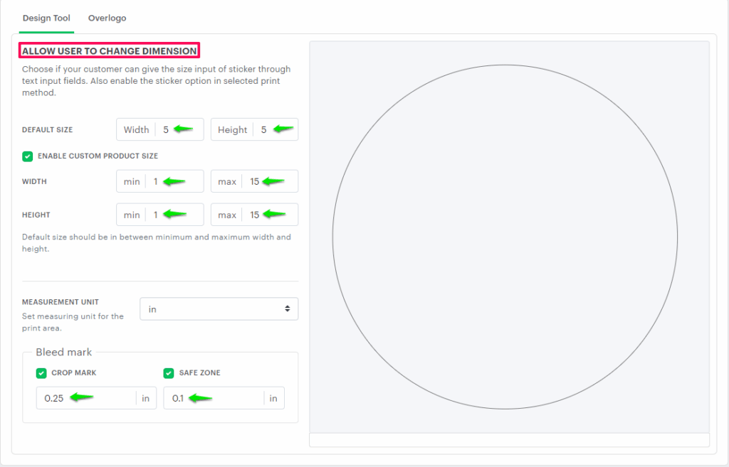 6. Select the checkbox for Enable Custom Product Size. Enter the dimensions for minimum width and maximum width, and also minimum height and maximum height. You can also set the bleed mark values for your sticker product.