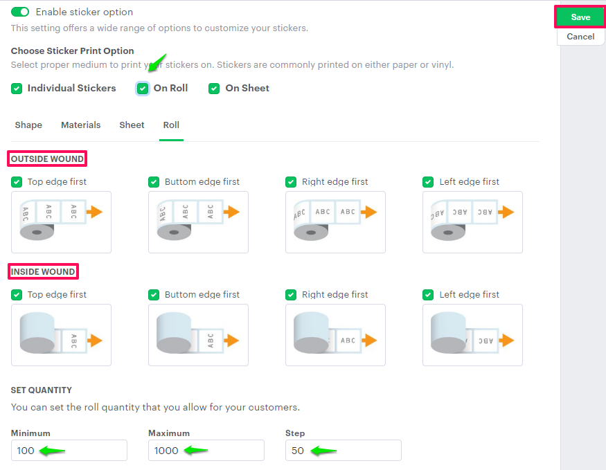 6. Enable the checkbox for the type of roll which you would like to enable for Stickers from the Outside Wound and Inside Wound. Also, set the minimum quantity, maximum quantity, and the step.
