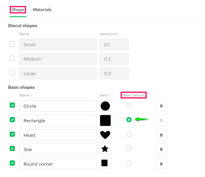 ► You can configure a default shape for sticker products. When the designer tool loads, it automatically displays the default shape set in the admin panel.