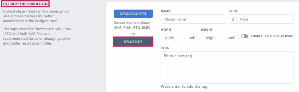 5. In the Clipart Information section, click “Upload ZIP.” Select the ZIP file from your local system and upload it.