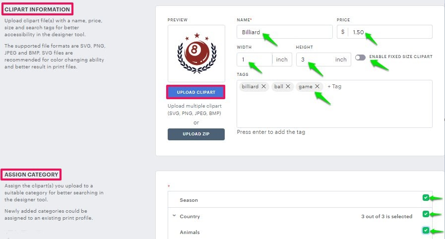 5. In the Clipart Information section, click Upload Clipart and set clipart information such as name, price, width, height, etc. From the Assign Category section, select the desired clipart category.