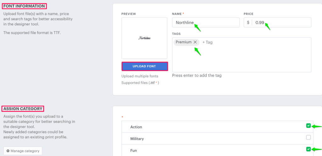 5. In the Font Information section, click “Upload Font” and set font details such as name, price, and tags. From the Assign Category section, select the desired font category.