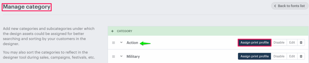 5. Under the Manage Category section, choose any category and click “Assign Print Profile.”