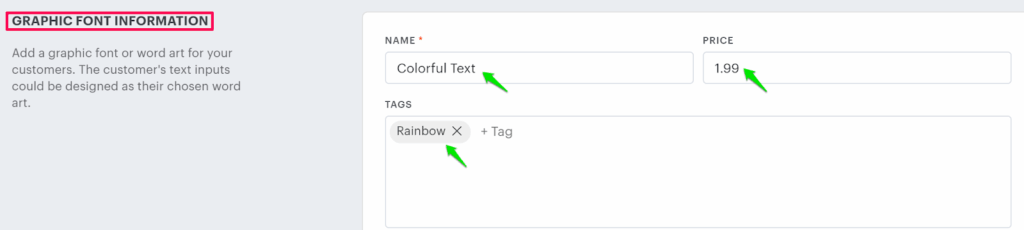 5. On the Graphic Font Information page, enter the graphic font details such as name, price, and tags.