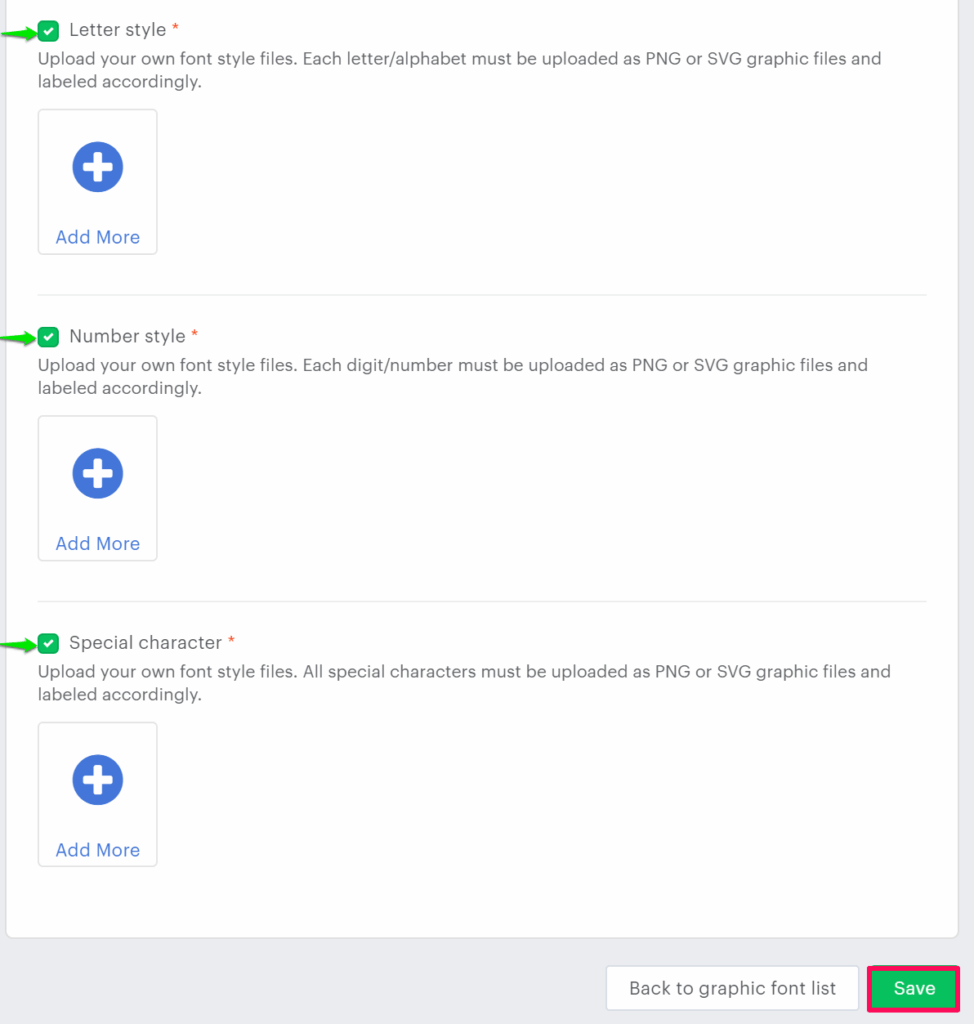 6. Enable any one of the options like Letter Style, Number Style, or Special Character, and click the plus icon (+) to upload your font style.