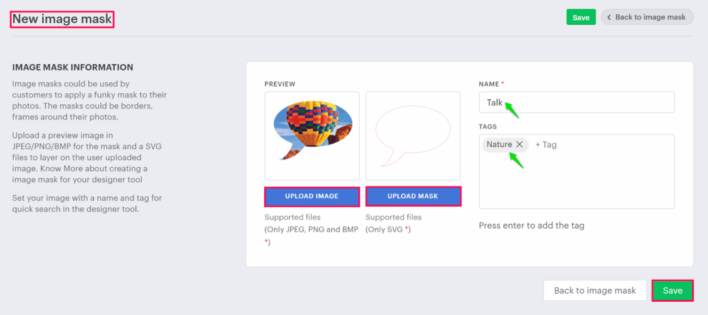 5. In the New Image Mask page, click “Upload Image” to upload the preview image, and then click “Upload Mask” to upload the respective mask. Enter the image mask information, such as name and tags.
