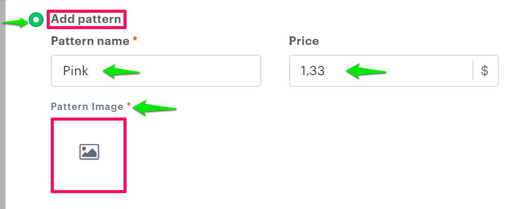 6. Select the radio button of Add Pattern, set the properties such as pattern name and price, then click the box under Pattern Image and upload the image from your local system.