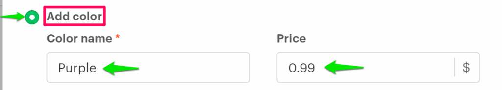 6. Select the radio button of Add Color and set the properties such as color name and price.