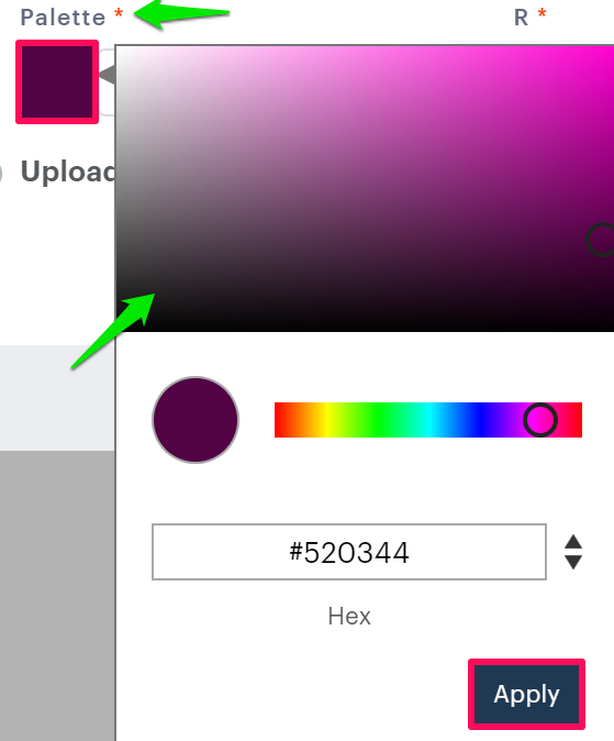 7. Click the square box under the palette and select a color from the color picker. Click “Apply.”