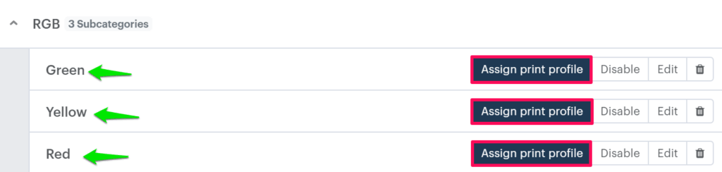 6. All the subcategories will be listed. Choose your desired subcategory and click on “Assign Print Profile.”