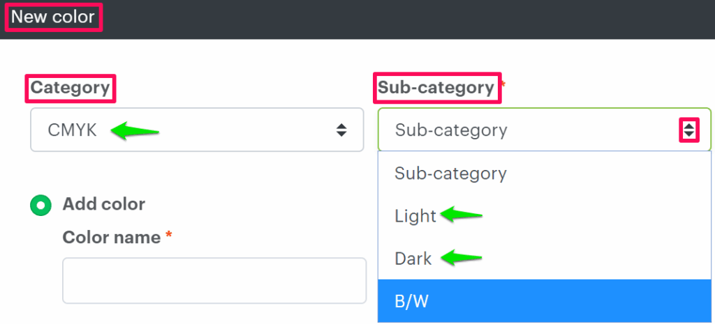 5. A pop-up named New Color will open. Select CMYK from the dropdown of Category. Then click the dropdown of “Sub-Category” and select your desired subcategory.