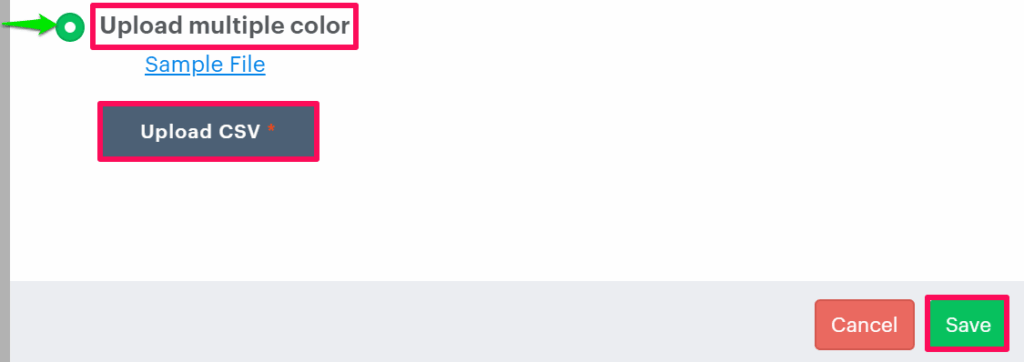 6. Select the radio button of Upload Multiple Color and click “Upload CSV”. Select the ZIP file from your local system and upload it.
