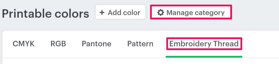 4. On the Printable Colors page, select the tab Embroidery Thread and click “Manage Category.”