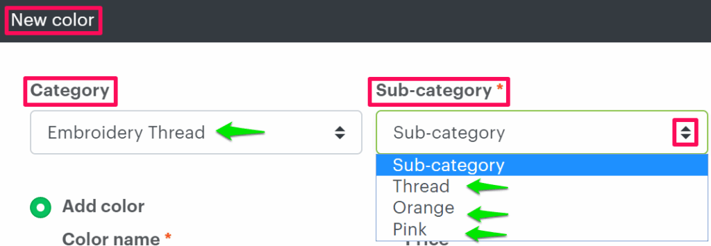 5. A pop-up named New Color will open. Select Embroidery Thread from the dropdown of Category. Then click the dropdown of Subcategory and select your desired subcategory.