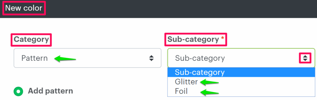 5. A pop-up named New Color will open. Select Pattern from the dropdown of Category. Then click the dropdown of Sub-category and select your desired subcategory.
