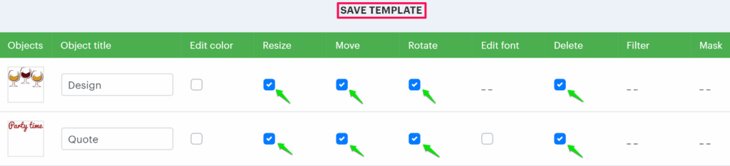 ► For each design element, enter the object title and enable the respective checkbox to lock the template properties such as Move, Resize, Rotate, Delete, etc.