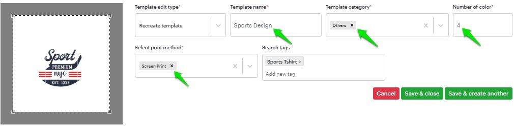► Set the properties of the template, such as Name, Category, Number of Colors, and Print Method.