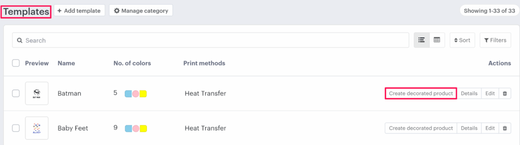 4. On the Templates page, click “Create Decorated Product”, which is below the Actions panel.