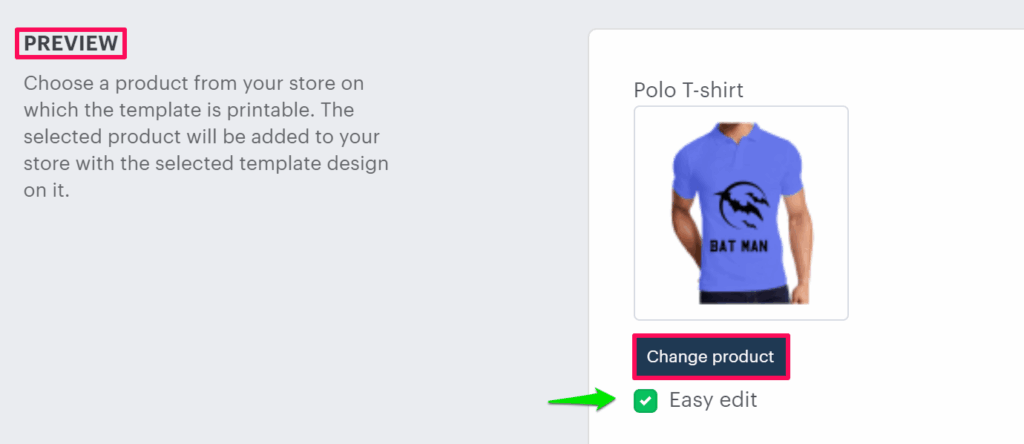 5. In the Preview section, move to the right to view the default product. Click “Change Product” if you want to use the template for another product.