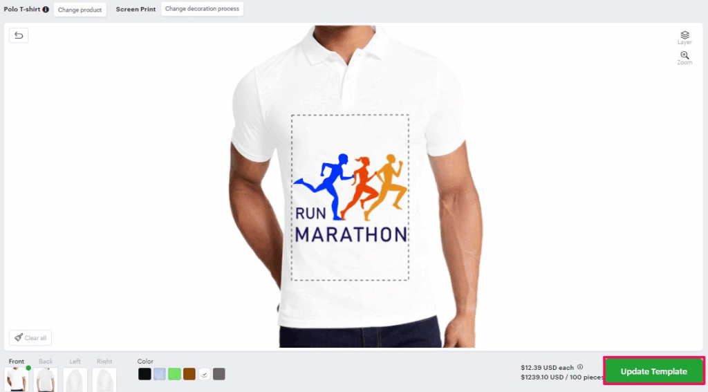 5. You will be taken to the designer tool. It loads with the template that you have selected and the product on which the template was created. Here, modify your template and click “UpdateTemplate.”