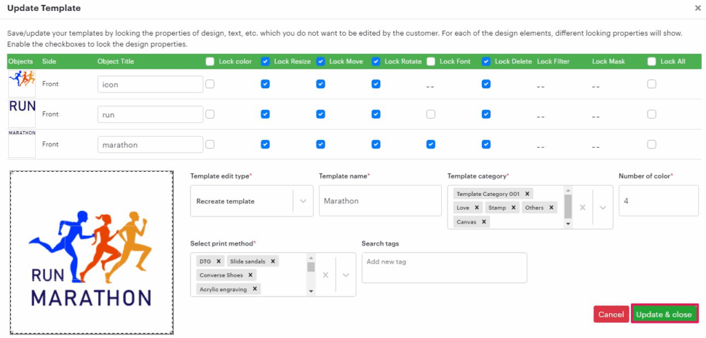 6. A pop-up will open, allowing you to modify template locking properties, edit type, name, category, and more. Once done, click “Update & Close.”