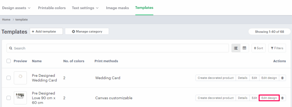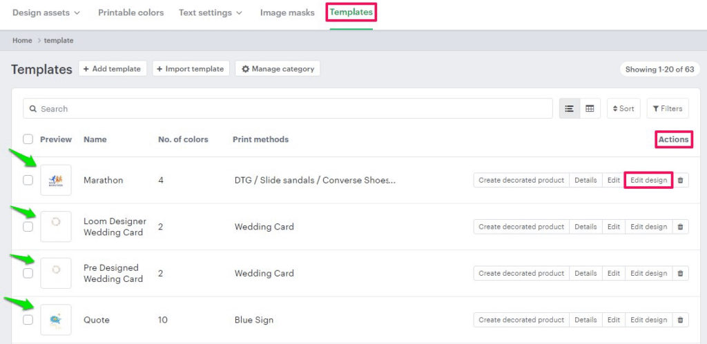 3. Click “Templates”, and a list of templates will appear below. Choose any template, and under the Actions panel, click “Edit Design” for the template you want to modify.