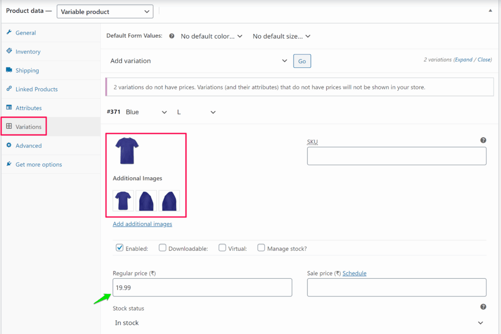 5. A box will appear. Hover over the product variants and click on it. Tap on the Upload Icon to set the product image and click “Add Additional Images” to provide other sides of the product. Enter the Regular Price for the product (other fields are optional).