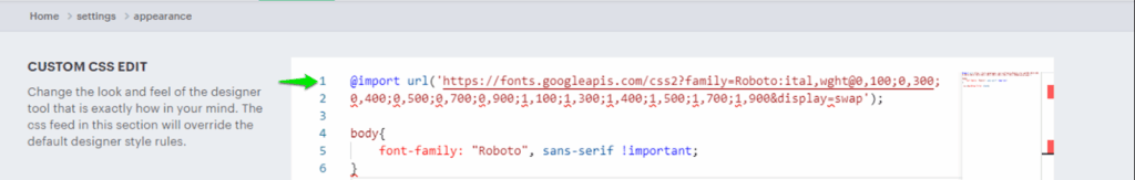 5. To change the designer tool’s text font to a Google font, declare the import URL at the top of the CSS editor.