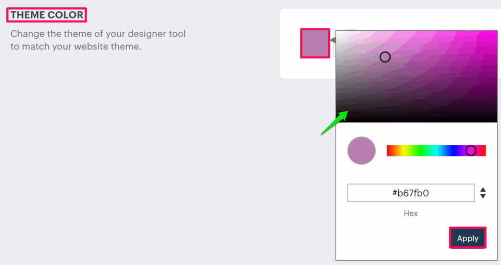 4. In the Theme Color section, click the color picker box, choose a color from the color picker, and click “Apply.”